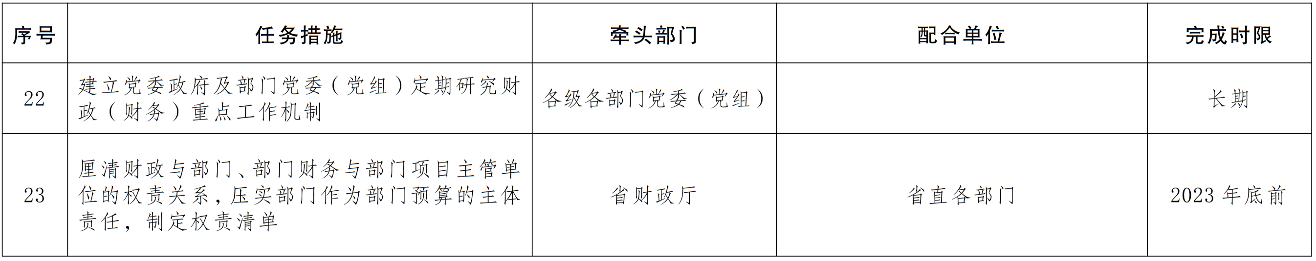 24.發(fā)揮職能部門高效協(xié)同的整體合力。進一步厘清財政與部門、部門財務與部門項目主管單位的權責關系,壓實部門作為部門預算的主體責任,明確權責清單,規(guī)范部門預算管理。完善各級政府分管領導、各部門財會人員教育培訓機制,提高履職能力水平。強化部門協(xié)同配合,建立有機貫通、信息共享、責任共擔、執(zhí)行有力、權責清晰、運轉高效的部門合作機制。