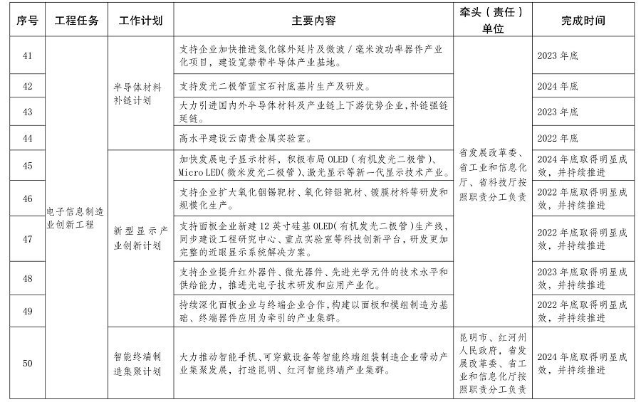 半導(dǎo)體材料補鏈計劃。依托優(yōu)勢企業(yè),加快布局和發(fā)展半導(dǎo)體材料,大力推進(jìn)產(chǎn)業(yè)鏈向上下游延伸,實現(xiàn)基礎(chǔ)電子材料和元器件產(chǎn)業(yè)化、規(guī)?;l(fā)展。支持貴金屬新材料產(chǎn)業(yè)園建設(shè),加快貴金屬前驅(qū)體材料產(chǎn)業(yè)化項目建設(shè),推進(jìn)實施稀貴金屬材料基因組等計劃,重點開展電子漿料、芯片封裝材料等研發(fā)及產(chǎn)業(yè)化孵化工作。支持企業(yè)在磷化銦、砷化鎵、碳化硅、超高純鍺單晶等光電子微電子材料領(lǐng)域擴(kuò)大生產(chǎn)規(guī)模,提高工藝水平。積極引進(jìn)GPU(圖形處理器)芯片封裝、板卡和高端服務(wù)器制造項目落地。支持企業(yè)加快推進(jìn)氮化鎵外延片及微波/毫米波功率器件產(chǎn)業(yè)化項目,建設(shè)寬禁帶半導(dǎo)體產(chǎn)業(yè)基地。支持發(fā)光二極管藍(lán)寶石襯底基片生產(chǎn)及研發(fā)。大力引進(jìn)國內(nèi)外半導(dǎo)體材料及產(chǎn)業(yè)鏈上下游優(yōu)勢企業(yè),補鏈強鏈延鏈,全面提升產(chǎn)業(yè)韌性。高水平建設(shè)云南貴金屬實驗室,聚焦稀貴金屬新材料領(lǐng)域突破關(guān)鍵核心技術(shù)瓶頸,打造引領(lǐng)性技術(shù)及產(chǎn)業(yè)。