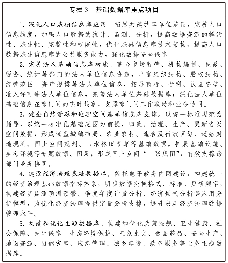1.建立健全基礎(chǔ)數(shù)據(jù)庫。升級(jí)完善人口、法人、自然資源與地理空間和電子證照等基礎(chǔ)信息資源庫,建立健全經(jīng)濟(jì)治理基礎(chǔ)數(shù)據(jù)庫,建立基礎(chǔ)數(shù)據(jù)更新聯(lián)動(dòng)運(yùn)維機(jī)制,根據(jù)典型應(yīng)用場(chǎng)景推進(jìn)基礎(chǔ)數(shù)據(jù)的標(biāo)簽化、主題化管理,開發(fā)高頻需求數(shù)據(jù)的共享服務(wù)接口,強(qiáng)化數(shù)據(jù)質(zhì)量管理和融合應(yīng)用,不斷提升基礎(chǔ)數(shù)據(jù)庫建設(shè)水平。圍繞商事制度改革和產(chǎn)業(yè)發(fā)展需要,增加自然人、企業(yè)等網(wǎng)絡(luò)經(jīng)營主體基礎(chǔ)信息,整合到法人單位基礎(chǔ)信息庫。