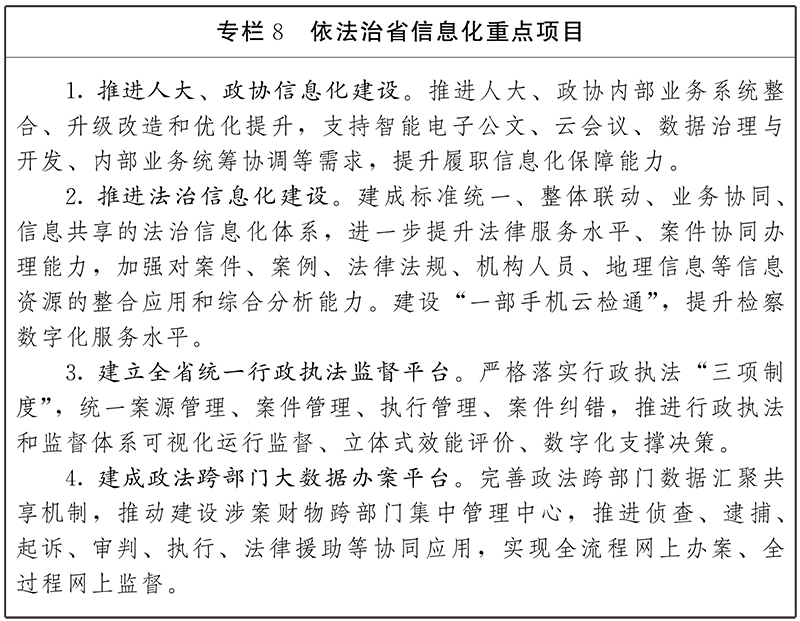 深化立法、監(jiān)督、協(xié)商、議政等業(yè)務(wù)應(yīng)用,完善人大代表、政協(xié)委員履職信息化應(yīng)用。構(gòu)建數(shù)據(jù)安全、集約高效的政法業(yè)務(wù)協(xié)同辦理平臺(tái),提升“智慧法院”、“智慧檢務(wù)”、“智慧警務(wù)”、“智慧司法”應(yīng)用水平和協(xié)同能力,提高審判執(zhí)行、多元解紛、司法公開、法律監(jiān)督、刑罰執(zhí)行、法律服務(wù)、協(xié)同辦案的智能化水平。推動(dòng)法治工作資源互聯(lián)互通、業(yè)務(wù)協(xié)同、信息共享,為依法治省提供決策支持。
