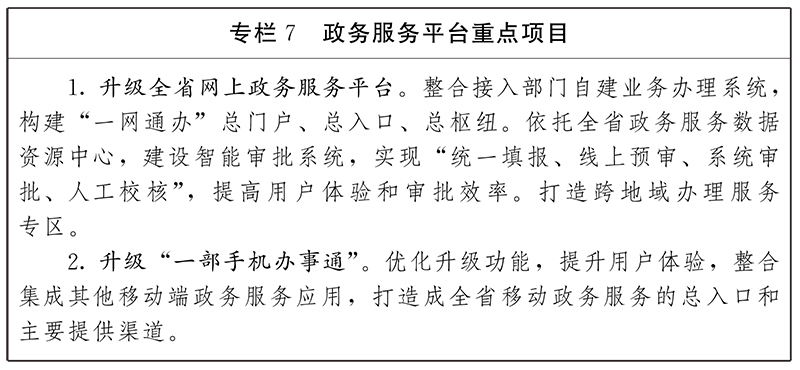 政務(wù)服務(wù)能力大幅提升。全省政務(wù)服務(wù)平臺(tái)更加易用、好用,政務(wù)服務(wù)“一網(wǎng)通辦”和標(biāo)準(zhǔn)化、規(guī)范化、便利化水平不斷提升;高頻民生政務(wù)服務(wù)事項(xiàng)實(shí)現(xiàn)“掌上辦”;非涉密政務(wù)服務(wù)事項(xiàng)網(wǎng)上可辦率達(dá)到99%,全程網(wǎng)辦和零跑動(dòng)率達(dá)到90%以上。線上線下融合服務(wù)更加完善。