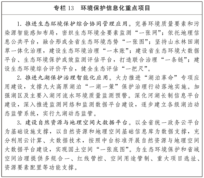 1.加強(qiáng)生態(tài)環(huán)境保護(hù)數(shù)字化應(yīng)用。以地理信息公共服務(wù)平臺(tái)為支撐,加強(qiáng)衛(wèi)星遙感、無人機(jī)、視頻監(jiān)控、傳感器“四位一體”綜合應(yīng)用,完善生態(tài)環(huán)境監(jiān)測(cè)網(wǎng)絡(luò),優(yōu)化監(jiān)測(cè)點(diǎn)位布局,廣泛開展生態(tài)監(jiān)測(cè)物聯(lián)網(wǎng)應(yīng)用。充分利用大數(shù)據(jù)等手段整合與挖掘生態(tài)環(huán)境監(jiān)測(cè)數(shù)據(jù)資源,提升區(qū)域大氣污染防治、流域污染防治、土壤污染防治等決策能力,構(gòu)建生態(tài)環(huán)境綜合管理信息化平臺(tái)。構(gòu)建重點(diǎn)江河湖泊治理數(shù)字化平臺(tái),匯集生態(tài)環(huán)境、水利、自然資源等部門的基礎(chǔ)數(shù)據(jù),重點(diǎn)建設(shè)智能感知、數(shù)據(jù)匯集、綜合應(yīng)用、多維展示、決策支撐等系統(tǒng)。