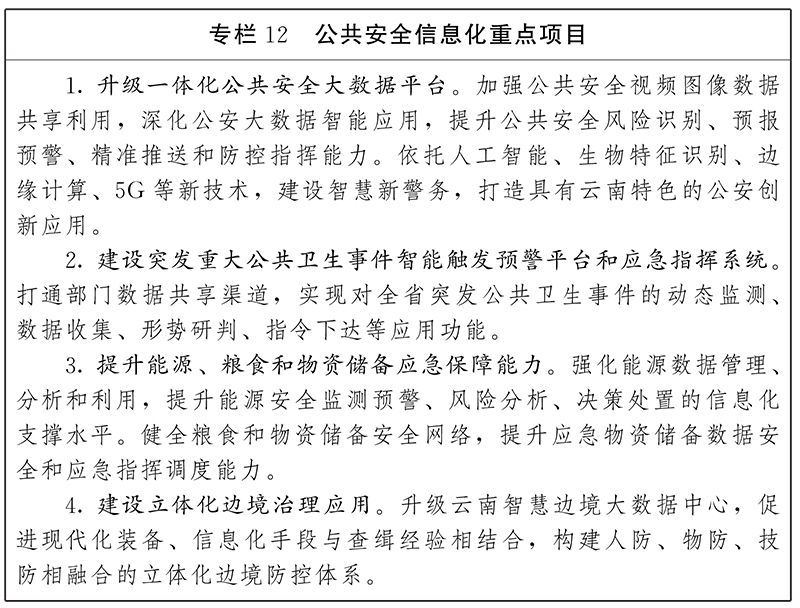 2.加強(qiáng)社會(huì)治安數(shù)字化應(yīng)用。推動(dòng)數(shù)字技術(shù)在法院、檢察院和司法行政、公安等部門的深度運(yùn)用,打通辦案平臺(tái),實(shí)現(xiàn)全流程網(wǎng)上“輕快”、“便捷”辦案。健全信息化社會(huì)治安防控體系,實(shí)現(xiàn)預(yù)測(cè)預(yù)警預(yù)防。推進(jìn)“雪亮工程”建設(shè),整合各類視頻監(jiān)控資源,加大在維穩(wěn)、反恐、打擊犯罪等公共安全防范領(lǐng)域的綜合應(yīng)用,提升防范化解社會(huì)風(fēng)險(xiǎn)的能力和水平。加快部署智能感知、信息采集等基礎(chǔ)設(shè)施,構(gòu)建邊境管控?cái)?shù)字防控網(wǎng),推進(jìn)邊境管控?cái)?shù)字化應(yīng)用,開展邊境車輛、人員大數(shù)據(jù)分析研判,提升邊境管控指揮系統(tǒng)可視化、數(shù)字化、智能化水平。