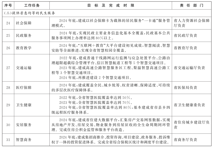 醫(yī)療保障。優(yōu)化醫(yī)療保障公共服務(wù),統(tǒng)一服務(wù)清單,實(shí)現(xiàn)醫(yī)療保障一站式服務(wù)、一窗口辦理、一單制結(jié)算。推進(jìn)醫(yī)保標(biāo)準(zhǔn)化和信息化建設(shè),統(tǒng)一醫(yī)療保障業(yè)務(wù)標(biāo)準(zhǔn)和技術(shù)標(biāo)準(zhǔn),完善全省醫(yī)療保障信息平臺(tái),全面推廣應(yīng)用醫(yī)保電子憑證,實(shí)現(xiàn)全省醫(yī)保經(jīng)辦機(jī)構(gòu)和定點(diǎn)醫(yī)藥機(jī)構(gòu)具備電子憑證應(yīng)用條件,覆蓋醫(yī)保支付、經(jīng)辦服務(wù)等應(yīng)用場(chǎng)景。建立統(tǒng)一的醫(yī)療保障服務(wù)熱線,加強(qiáng)經(jīng)辦能力建設(shè),大力推進(jìn)服務(wù)下沉,實(shí)現(xiàn)省、市、縣、鄉(xiāng)鎮(zhèn)(街道)、村(社區(qū))全覆蓋。增強(qiáng)醫(yī)藥服務(wù)可及性,規(guī)范“互聯(lián)網(wǎng)+醫(yī)療”等新服務(wù)模式發(fā)展,打通“互聯(lián)網(wǎng)+醫(yī)療”納入醫(yī)保支付,健全短缺藥品監(jiān)測(cè)預(yù)警和分級(jí)應(yīng)對(duì)體系。到2024年底,加快建成覆蓋全民、城鄉(xiāng)統(tǒng)籌、權(quán)責(zé)清晰、保障適度、可持續(xù)的多層次醫(yī)療保障體系。