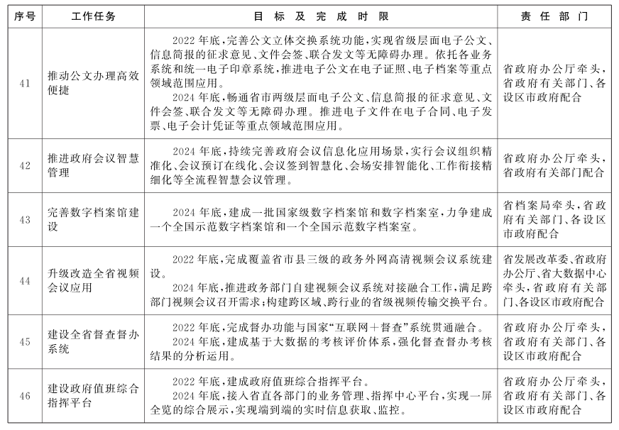 ——政務(wù)運(yùn)轉(zhuǎn)效能領(lǐng)先省份。健全政務(wù)運(yùn)轉(zhuǎn)機(jī)制,顯著提升政府機(jī)關(guān)辦文、辦會(huì)、辦事、督查督辦和值班管理效能,提升部門(mén)間智能化協(xié)同能力。著力打造全省政務(wù)協(xié)同總品牌,全面提升政務(wù)協(xié)同辦公平臺(tái)用戶覆蓋面,全面實(shí)現(xiàn)與各部門(mén)辦公系統(tǒng)、主要業(yè)務(wù)應(yīng)用系統(tǒng)聯(lián)通,政務(wù)外網(wǎng)高清視頻會(huì)議系統(tǒng)實(shí)現(xiàn)省市縣鄉(xiāng)四級(jí)全覆蓋,政務(wù)協(xié)同水平持續(xù)提升。協(xié)同推進(jìn)鄉(xiāng)村治理、城市治理、社會(huì)治理、應(yīng)急管理、生態(tài)治理等數(shù)字化建設(shè),提升協(xié)同治理水平,確保協(xié)同治理成效保持全國(guó)一流,公眾安全感滿意度達(dá)到95%以上,打造共建共治共享的協(xié)同治理格局。