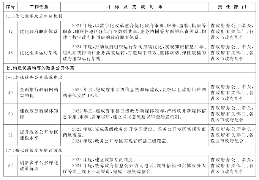 ——政務(wù)環(huán)境透明度一流省份。聚焦公開(kāi)事項(xiàng)標(biāo)準(zhǔn)化、解讀回應(yīng)規(guī)范化、政府網(wǎng)站集約化、政務(wù)新媒體矩陣化、政務(wù)公開(kāi)專(zhuān)區(qū)集群化,創(chuàng)新政務(wù)公開(kāi)工作思路和方式,大力推進(jìn)26個(gè)重點(diǎn)領(lǐng)域政務(wù)公開(kāi)標(biāo)準(zhǔn)化規(guī)范化建設(shè),深入推進(jìn)政府網(wǎng)站集約應(yīng)用,建設(shè)以省政府微信公眾號(hào)為龍頭的全省政務(wù)新媒體傳播矩陣,提升政務(wù)公開(kāi)專(zhuān)區(qū)建設(shè)水平,著力打造公開(kāi)透明的政務(wù)環(huán)境。