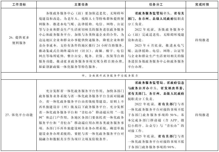 2022年底前,省、市(州)、縣(市、區(qū)、行委)、鄉(xiāng)鎮(zhèn)(街道)、村(社區(qū))五級(jí)政務(wù)服務(wù)能力和水平顯著提升,建立全省政務(wù)服務(wù)事項(xiàng)基本目錄清單并進(jìn)行動(dòng)態(tài)管理,各級(jí)政務(wù)服務(wù)中心規(guī)范、高效運(yùn)行,綜合服務(wù)窗口全覆蓋,為企業(yè)和群眾辦事提供全省統(tǒng)一的一體化政務(wù)服務(wù)平臺(tái)總門戶,“一網(wǎng)通辦”服務(wù)能力顯著提升,企業(yè)和群眾經(jīng)常辦理的政務(wù)服務(wù)事項(xiàng)實(shí)現(xiàn)“跨省通辦”;2025年底前,全省政務(wù)服務(wù)標(biāo)準(zhǔn)化、規(guī)范化、便利化水平大幅提升,省一體化政務(wù)服務(wù)平臺(tái)服務(wù)能力全面提升,“網(wǎng)上辦、掌上辦、就近辦、一次辦”更加好辦易辦,政務(wù)服務(wù)線上線下深度融合、協(xié)調(diào)發(fā)展,高頻電子證照實(shí)現(xiàn)全省互通互認(rèn),高頻政務(wù)服務(wù)事項(xiàng)實(shí)現(xiàn)全省無差別受理、同標(biāo)準(zhǔn)辦理,“免證辦”全面推行,全面打響政務(wù)服務(wù)“青松辦”品牌。