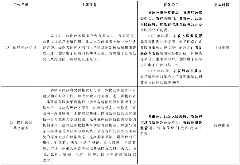28.拓展平臺(tái)應(yīng)用。發(fā)揮省一體化政務(wù)服務(wù)平臺(tái)公共入口、公共通道、公共支撐的總樞紐作用,建立完善政務(wù)服務(wù)統(tǒng)一身份認(rèn)證系統(tǒng),規(guī)范各地區(qū)各部門電子印章制發(fā)核驗(yàn)和用印管理工作,加快電子證照歸集共享應(yīng)用,實(shí)現(xiàn)電子證照簽發(fā)以及跨地區(qū)、跨層級(jí)互通互認(rèn)。(牽頭單位:省政務(wù)服務(wù)監(jiān)管局、省發(fā)展改革委;責(zé)任單位:省有關(guān)部門,各市州、縣級(jí)人民政府,省政府信息與政務(wù)公開辦;完成時(shí)限:持續(xù)推進(jìn))
