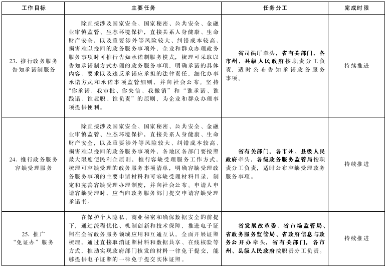 23.推行政務(wù)服務(wù)告知承諾制服務(wù)。除直接涉及國家安全、國家秘密、公共安全、金融業(yè)審慎監(jiān)管、生態(tài)環(huán)境保護(hù),直接關(guān)系人身健康、生命財(cái)產(chǎn)安全,以及重要涉外等風(fēng)險(xiǎn)較大、糾錯(cuò)成本較高、損害難以挽回的政務(wù)服務(wù)事項(xiàng)外,企業(yè)和群眾辦理政務(wù)服務(wù)事項(xiàng)時(shí)可推行告知承諾制服務(wù)模式,梳理可采取以告知承諾制方式辦理的政務(wù)服務(wù)事項(xiàng),明確承諾的具體內(nèi)容、要求以及違反承諾應(yīng)承擔(dān)的法律責(zé)任,細(xì)化辦事承諾方式和承諾事項(xiàng)監(jiān)管細(xì)則,并向社會(huì)公布。堅(jiān)持“你承諾、我審批、你失信、我撤銷”和“誰承諾、誰踐諾、誰履職、誰負(fù)責(zé)”的原則,為企業(yè)和群眾辦理事項(xiàng)提供便利。(牽頭單位:省司法廳;責(zé)任單位:省有關(guān)部門,各市州、縣級(jí)人民政府;完成時(shí)限:持續(xù)推進(jìn))