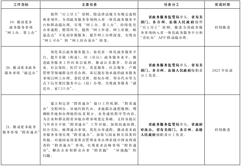 19.推動(dòng)更多政務(wù)服務(wù)事項(xiàng)“網(wǎng)上辦、掌上辦”。按照“應(yīng)上盡上”原則,除法律法規(guī)另有規(guī)定或特殊事項(xiàng)外,全部政務(wù)服務(wù)事項(xiàng)納入省一體化政務(wù)服務(wù)平臺(tái)和移動(dòng)端辦理,實(shí)現(xiàn)“網(wǎng)上辦、掌上辦”。持續(xù)優(yōu)化辦事流程、精簡環(huán)節(jié),提供“網(wǎng)上申請、網(wǎng)上審批、郵遞送達(dá)”不見面審批服務(wù),提升網(wǎng)上辦理深度,實(shí)現(xiàn)由“網(wǎng)上可辦”到“網(wǎng)上好辦易辦”轉(zhuǎn)變。(牽頭單位:省政務(wù)服務(wù)監(jiān)管局;責(zé)任單位:省有關(guān)部門,各市州、縣級(jí)人民政府;完成時(shí)限:持續(xù)推進(jìn))