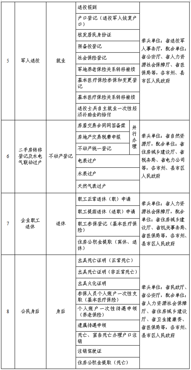 一、梳理明確“一件事”。將《指導(dǎo)意見》“一件事一次辦”事項(xiàng)基礎(chǔ)清單與《行動(dòng)方案》所部署的26個(gè)主題式、套餐式場景應(yīng)用(以下稱主題)結(jié)合起來落實(shí)并做適當(dāng)調(diào)整,明確牽頭單位和配合單位。如將《指導(dǎo)意見》事項(xiàng)基礎(chǔ)清單中的“企業(yè)開辦”“企業(yè)準(zhǔn)營”事項(xiàng)納入《行動(dòng)方案》中的“企業(yè)開辦”主題,將“企業(yè)簡易注銷”事項(xiàng)納入“企業(yè)注銷”主題(詳見附件)。將《行動(dòng)方案》要求在2023年底前完成的“員工保障”“就業(yè)”“婚姻”“身后”等4個(gè)主題提前至2022年底前完成。鼓勵(lì)各地結(jié)合實(shí)際拓展本地區(qū)“一件事一次辦”事項(xiàng)范圍。