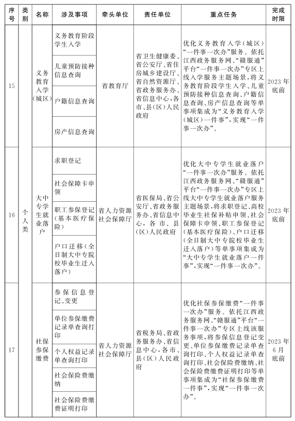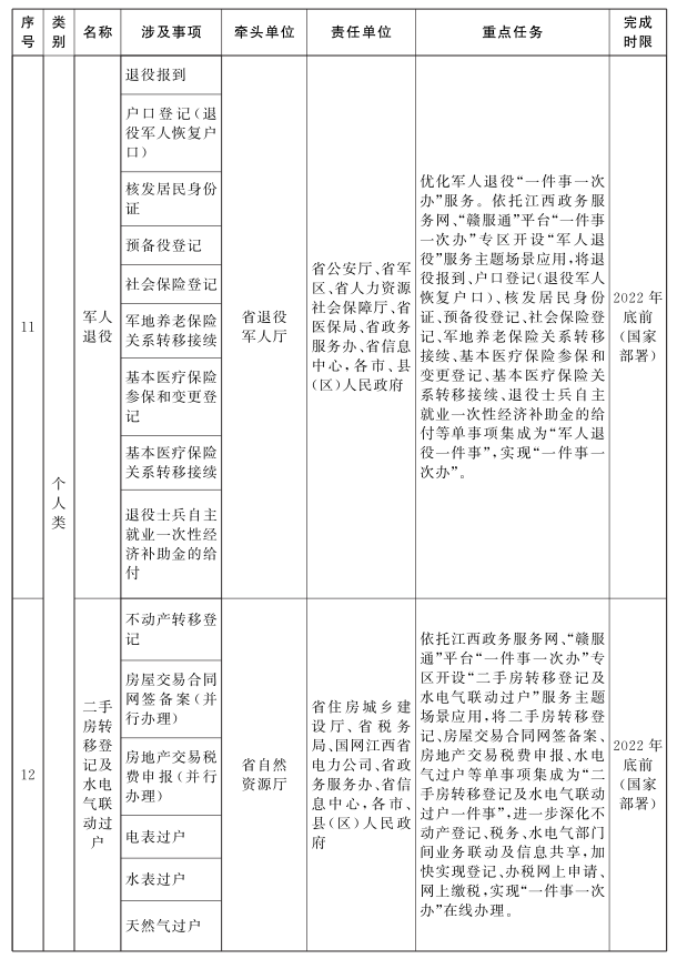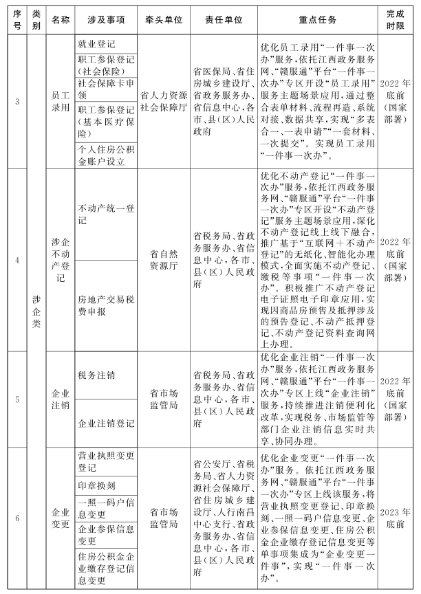 ?。ㄒ唬U(kuò)大“一件事一次辦”事項(xiàng)范圍。各地各部門要積極推進(jìn)企業(yè)和個(gè)人全生命周期相關(guān)政務(wù)服務(wù)事項(xiàng)“一件事一次辦”。圍繞企業(yè)從開辦到注銷全生命周期的重要階段,梳理集成同一階段內(nèi)需要到2個(gè)或2個(gè)以上部門辦理的多個(gè)單一政務(wù)服務(wù)事項(xiàng),為企業(yè)提供開辦、工程建設(shè)、生產(chǎn)經(jīng)營、惠企政策兌現(xiàn)、員工錄用、不動(dòng)產(chǎn)登記、注銷等集成化辦理服務(wù);圍繞個(gè)人從出生到身后全生命周期的重要階段,梳理集成同一階段內(nèi)需要到2個(gè)或2個(gè)以上部門辦理的多個(gè)單一政務(wù)服務(wù)事項(xiàng),為群眾提供新生兒出生、入園入學(xué)、大中專學(xué)生畢業(yè)、就業(yè)、就醫(yī)、婚育、扶殘助困、軍人退役、二手房交易及水電氣聯(lián)動(dòng)過戶、退休、身后等集成化辦理服務(wù)。各地要全面組織實(shí)施《江西省政務(wù)服務(wù)“一件事一次辦”事項(xiàng)清單》任務(wù)。鼓勵(lì)各地結(jié)合實(shí)際,進(jìn)一步擴(kuò)大“一件事一次辦”范圍,確保企業(yè)和個(gè)人全生命周期重要階段涉及的更多政務(wù)服務(wù)事項(xiàng)實(shí)現(xiàn)“一件事一次辦”。