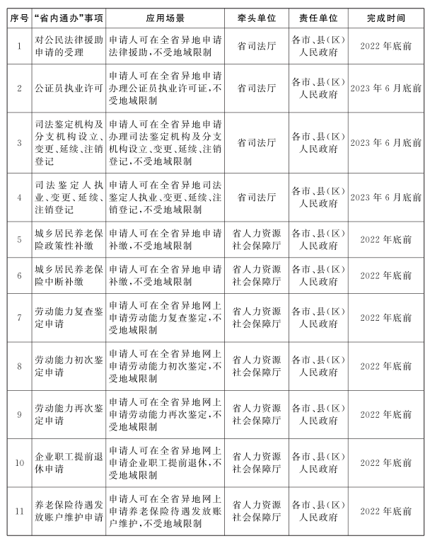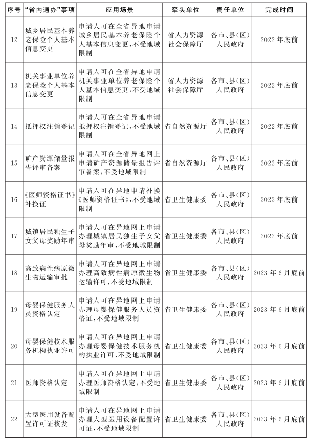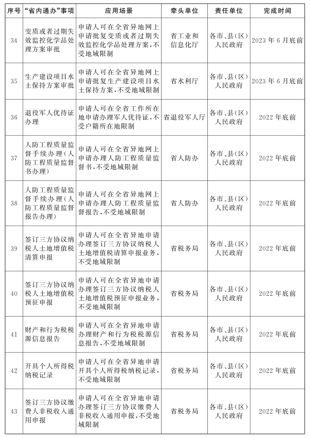 ?。ǘ┕ぷ髂繕?biāo)。2022年底前,建立部門協(xié)同、整體聯(lián)動(dòng)的工作機(jī)制,完成國家部署的企業(yè)和個(gè)人政務(wù)服務(wù)“一件事一次辦”事項(xiàng)基礎(chǔ)清單、政務(wù)服務(wù)“跨省通辦”新增任務(wù)清單和省里梳理的第二批“省內(nèi)通辦”政務(wù)服務(wù)事項(xiàng)清單(見附件1、2、3)確定的任務(wù)。2023年底前,完成省里梳理的“一件事一次辦”事項(xiàng)清單(見附件1),根據(jù)實(shí)際適時(shí)拓展本地區(qū)“一件事一次辦”“跨省通辦”“省內(nèi)通辦”事項(xiàng)范圍。2025年底前,“一件事一次辦”“跨省通辦”“省內(nèi)通辦”事項(xiàng)范圍進(jìn)一步擴(kuò)大,服務(wù)領(lǐng)域進(jìn)一步拓展,企業(yè)和個(gè)人全生命周期重要階段以及高頻異地辦事需求涉及的更多政務(wù)服務(wù)事項(xiàng)實(shí)現(xiàn)“一件事一次辦”“跨省通辦”“省內(nèi)通辦”,政務(wù)服務(wù)效能全面提升,打造政務(wù)服務(wù)升級(jí)版,更好滿足企業(yè)和群眾辦事需求。