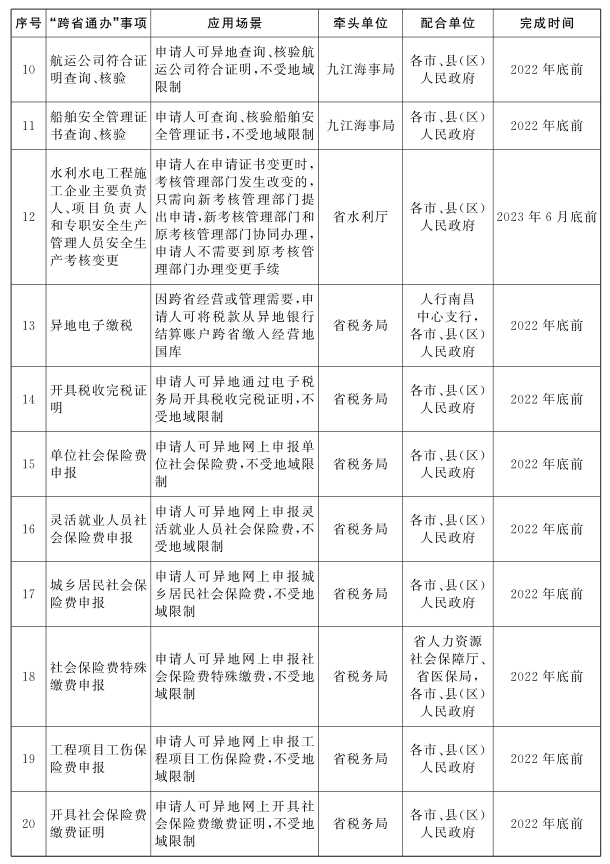 ?。ǘ┩卣埂爱惖赝ㄞk”事項(xiàng)范疇。各地各部門要在完成《江西省人民政府辦公廳關(guān)于印發(fā)加快推進(jìn)政務(wù)服務(wù)“跨省通辦”“省內(nèi)通辦”工作方案的通知》(贛府廳字〔2020〕86號(hào))文件布置的“跨省通辦”“省內(nèi)通辦”事項(xiàng)清單任務(wù)基礎(chǔ)上,組織實(shí)施《國家部署的政務(wù)服務(wù)“跨省通辦”新增任務(wù)清單》《全省第二批政務(wù)服務(wù)“省內(nèi)通辦”清單》。同時(shí),圍繞實(shí)施區(qū)域重大戰(zhàn)略,聚焦城市群都市圈一體化發(fā)展、主要?jiǎng)趧?wù)輸入輸出地協(xié)作、毗鄰地區(qū)交流合作等需求,及時(shí)梳理地區(qū)間“跨省通辦”合作中共性、高頻的異地辦事需求,聚焦便利企業(yè)跨區(qū)域經(jīng)營和加快解決群眾關(guān)切事項(xiàng)的異地辦理問題,健全清單化管理和動(dòng)態(tài)更新機(jī)制。按照需求量大、覆蓋面廣、辦理頻次高的原則,推出更多政務(wù)服務(wù)事項(xiàng)納入“跨省通辦”“省內(nèi)通辦”范疇。