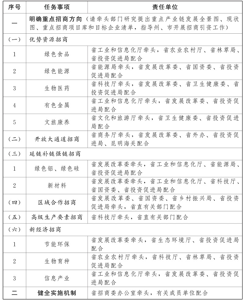 各地“一把手”要以上率下,做好產(chǎn)業(yè)謀劃、項目策劃、招商計劃,帶頭外出招商、會見重要客商、推進項目落地;省級產(chǎn)業(yè)主抓部門要落實好招商引資工作的重要責任,牽頭引進、統(tǒng)籌協(xié)調(diào),帶領(lǐng)各地多渠道、多形式開展外出招商活動;州、市和園區(qū)要承擔項目引進、落地主體責任,強化招商項目全過程保障服務(wù)。