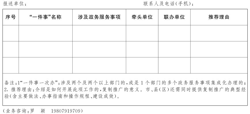 2.梳理第二批“一件事一次辦”事項(xiàng)。對(duì)部分企業(yè)群眾辦理某些事項(xiàng)還需多頭跑、反復(fù)跑等問題,各地、各部門要繼續(xù)圍繞企業(yè)和個(gè)人全生命周期,將關(guān)聯(lián)性強(qiáng)、辦件需求量大,涉及兩個(gè)及兩個(gè)以上部門,或是1個(gè)部門的多個(gè)政務(wù)服務(wù)事項(xiàng)進(jìn)行集成,實(shí)行“一件事一次辦”。省直部門梳理有意愿且可行的,市、縣(區(qū))梳理已開展且條件成熟可在全省復(fù)制推廣的“一件事”,匯總填寫《第二批“一件事一次辦”事項(xiàng)清單》(附件2)。市、縣(區(qū))還需同時(shí)提供復(fù)制推廣的典型經(jīng)驗(yàn)(含主要做法、辦事指南和操作規(guī)程、建設(shè)成效)。