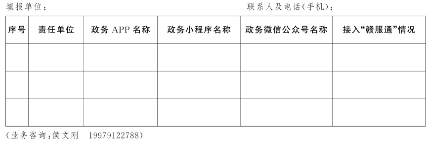 4.梳理政務(wù)APP、政務(wù)小程序、政務(wù)微信公眾號(hào)清單。為有效解決“贛服通”平臺(tái)接入部門服務(wù)較少、可辦理事項(xiàng)不多、企業(yè)群眾掌上咨詢或辦事需求得不到滿足等問題,各地、各部門要將涉及為企業(yè)群眾提供政務(wù)服務(wù)的各類政務(wù)APP、政務(wù)小程序、政務(wù)微信公眾號(hào)進(jìn)行集中摸排梳理,匯總填寫《政務(wù)APP、政務(wù)小程序、政務(wù)微信公眾號(hào)摸底情況表》(附件4)。