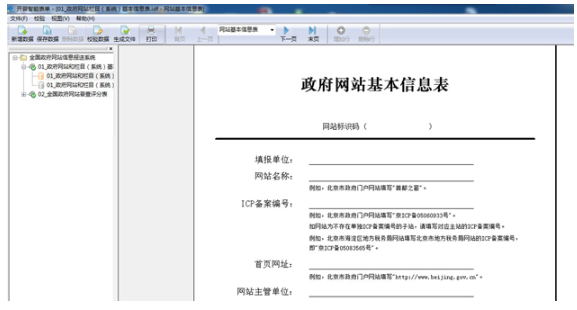 填報(bào)單位運(yùn)行客戶(hù)端軟件,打開(kāi)“政府網(wǎng)站和欄目(系統(tǒng))基本信息表”并新建數(shù)據(jù),填寫(xiě)政府網(wǎng)站和欄目(系統(tǒng))基本信息并保存。表單所有信息項(xiàng)均為必填項(xiàng),如確無(wú)內(nèi)容請(qǐng)?zhí)顚?xiě)“無(wú)”。
