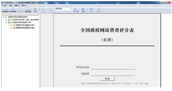 填報(bào)單位打開(kāi)客戶(hù)端軟件,選取“全國(guó)政府網(wǎng)站普查評(píng)分表”并新建數(shù)據(jù),首先輸入“網(wǎng)站標(biāo)識(shí)碼”和“校驗(yàn)碼”,通過(guò)驗(yàn)證后,填寫(xiě)該網(wǎng)站的自查評(píng)分信息并保存。