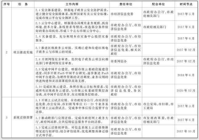 2016年9月前,市政府辦公廳根據(jù)計劃安排,匯總并梳理各部門2017年擬上云的項目范圍和清單;市經(jīng)濟信息化委根據(jù)上云遷移計劃,完成相應(yīng)的信息化項目在下一年度的運維方案和運維資金調(diào)整;市財政局對預算資金予以保障。