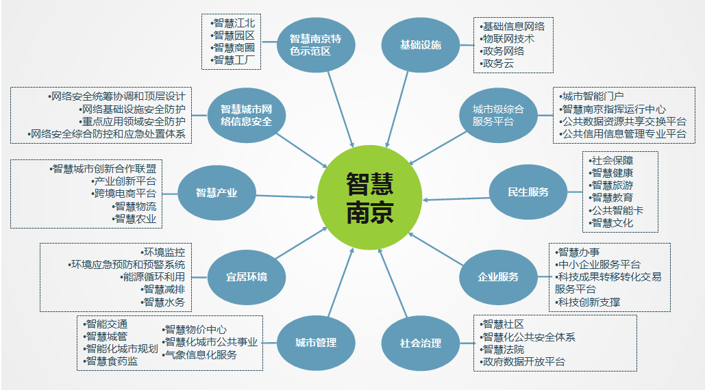 “十三五”期間,智慧南京建設(shè)的重點任務(wù)涵蓋基礎(chǔ)設(shè)施建設(shè)、城市級云服務(wù)平臺建設(shè)、注重民生服務(wù)、創(chuàng)新社會治理、突出網(wǎng)絡(luò)與信息安全、促進(jìn)生態(tài)宜居、做好示范區(qū)域的示范工程等方面任務(wù)。