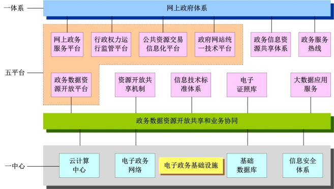 為解決當(dāng)前政府?dāng)?shù)據(jù)開放程度不高,信息共享和業(yè)務(wù)協(xié)同難的問題,利用互聯(lián)網(wǎng)、大數(shù)據(jù)、云計算技術(shù)發(fā)展“互聯(lián)網(wǎng)+政務(wù)服務(wù)”,是提升政府行政效能,提高群眾辦事便捷程度,加強行政效能在線監(jiān)察的有效舉措。發(fā)展“互聯(lián)網(wǎng)+政務(wù)服務(wù)”要圍繞打造“一體系、一中心、五平臺”來進行?!耙惑w系”即網(wǎng)上政府體系,“一中心”即政務(wù)云計算中心,“五平臺”即網(wǎng)上政務(wù)服務(wù)平臺、行政權(quán)力運行監(jiān)管平臺、公共資源交易信息化平臺、政府網(wǎng)站統(tǒng)一技術(shù)平臺、政務(wù)數(shù)據(jù)資源開放平臺。整個“互聯(lián)網(wǎng)+政務(wù)服務(wù)”體系建設(shè)框架如圖3所示。