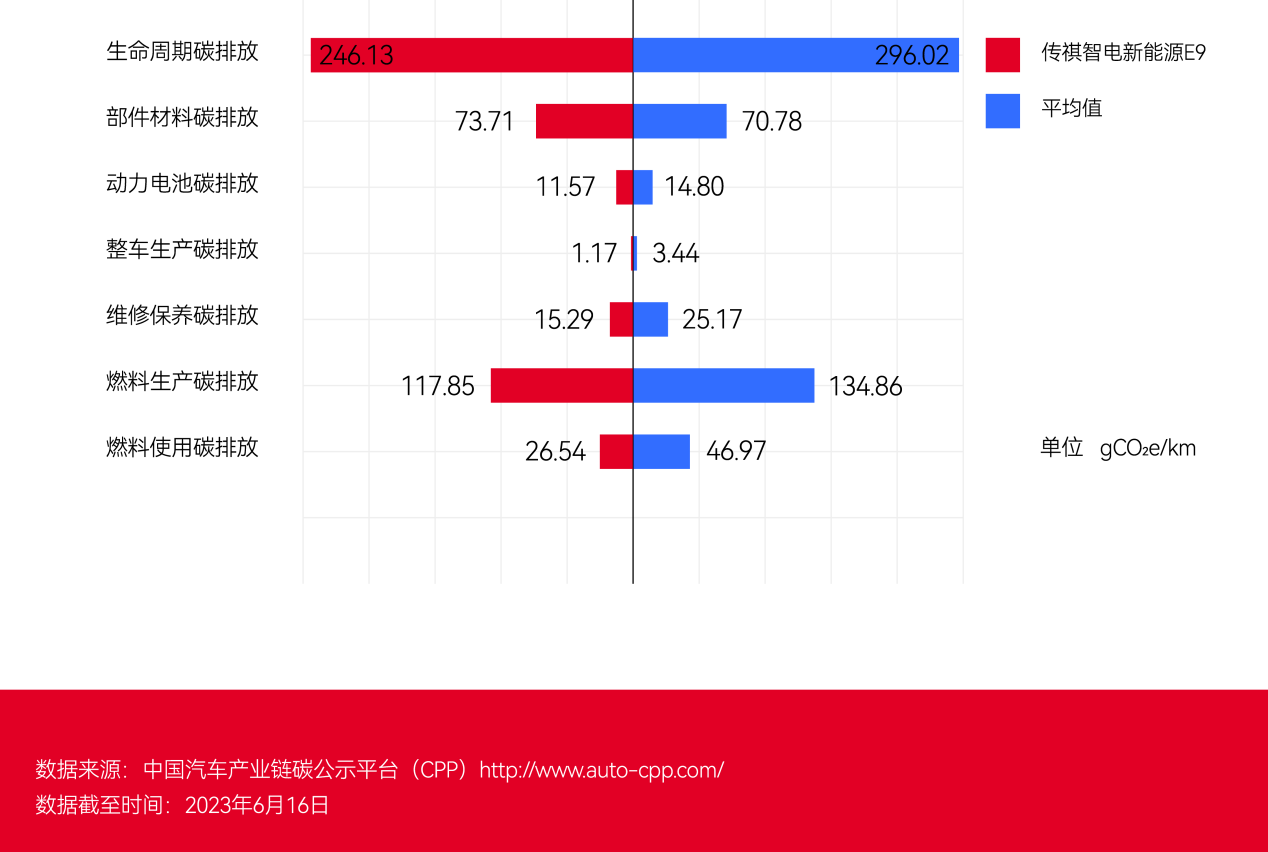 以“C級(jí)插電式混合動(dòng)力MPV”級(jí)別為例,在3個(gè)車系共11款不同銷售型號(hào)車型中,傳祺智電新能源E9在電池、電機(jī)、電控領(lǐng)域優(yōu)勢(shì)突出,具有核心專利的機(jī)電耦合系統(tǒng)、彈匣電池和智能能量管理系統(tǒng),整車碳足跡為246.13克二氧化碳當(dāng)量每千米(gCO2e/km),行業(yè)均值為296.02克二氧化碳當(dāng)量每千米(gCO2e/km),比行業(yè)均值低16.9%。