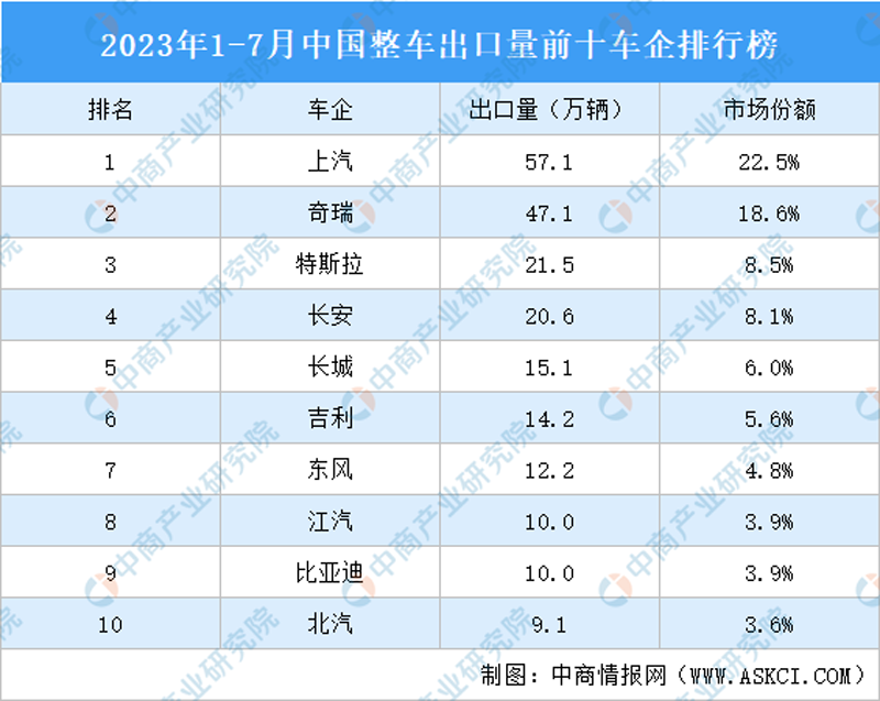 與上年同期相比,比亞迪出口10萬輛,同比增長7.9倍;奇瑞出口47.1萬輛,同比增長1.4倍;長城出口15.1萬輛,同比增長94.7%。