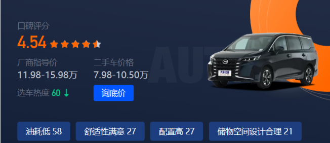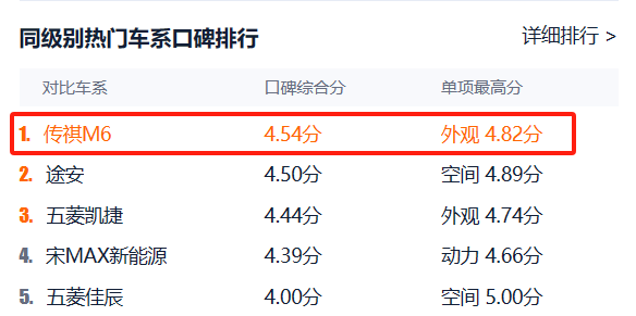 近幾年,在家用MPV風口下,也有越來越多車企發(fā)力10-15萬級MPV。在汽車之家口碑頁,對比同級主流MPV,傳祺M6的口碑評分一直保持著第 一的領 先位置,絕大多數(shù)對其的評價都是空間大、舒適性高、性價比高。