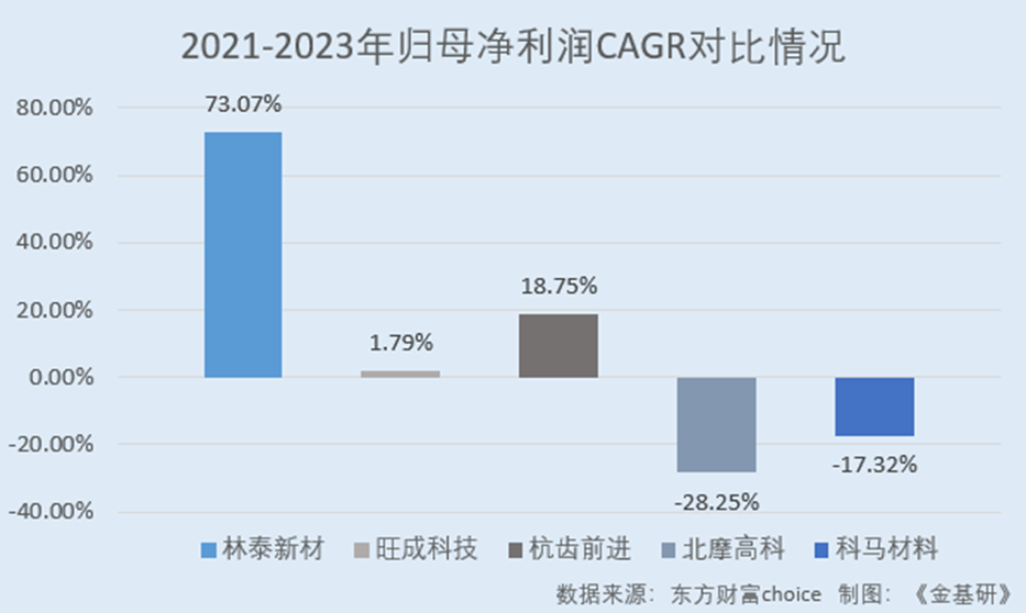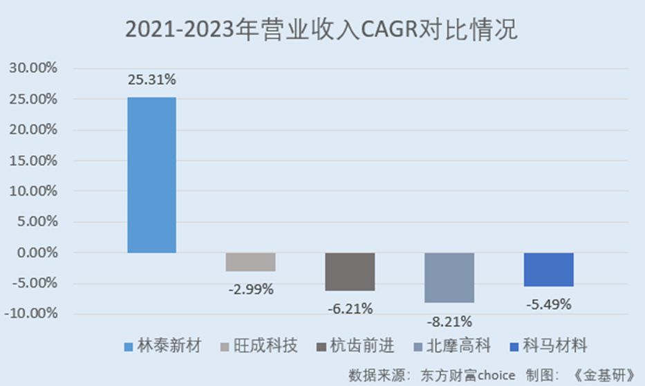 據(jù)東方財(cái)富choice數(shù)據(jù),2021-2023年,林泰新材同行業(yè)可比公司重慶市旺成科技股份有限公司(以下簡稱“旺成科技”)、杭州前進(jìn)齒輪箱集團(tuán)股份有限公司(以下簡稱“杭齒前進(jìn)”)、北京北摩高科摩擦材料股份有限公司(以下簡稱“北摩高科”)、浙江科馬摩擦材料股份有限公司(以下簡稱“科馬材料”)的營收CAGR分別為-2.99%、-6.21%、-8.21%、-5.49%;歸母凈利潤C(jī)AGR分別為1.79%、18.75%、-28.25%、-17.32%。