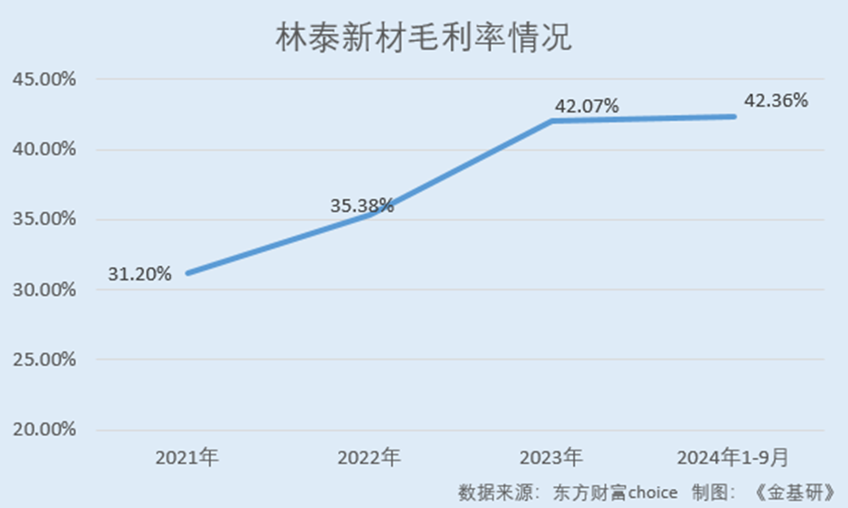據(jù)東方財(cái)富choice數(shù)據(jù),2021-2023年及2024年1-9月,林泰新材的毛利率分別為31.20%、35.38%、42.07%、42.36%。