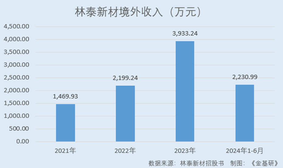 據(jù)招股書,2021-2023年及2024年1-6月,林泰新材境外客戶數(shù)量分別為56家、79家、134家、109家,境外收入分別為1,469.93萬元、2,199.24萬元、3,933.24萬元、2,230.99萬元。
