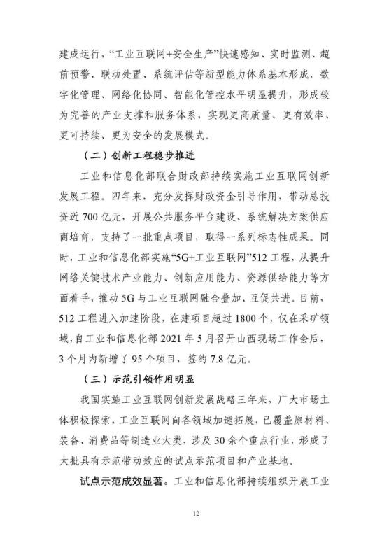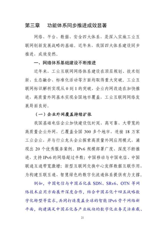 10月18日,在2021全球工業(yè)互聯(lián)網(wǎng)大會(huì)上,中國(guó)工業(yè)互聯(lián)網(wǎng)研究院院長(zhǎng)魯春叢發(fā)布了《工業(yè)互聯(lián)網(wǎng)創(chuàng)新發(fā)展成效報(bào)告(20182021年)》(以下簡(jiǎn)稱《報(bào)告》)?!秷?bào)告》指出,自工業(yè)互聯(lián)網(wǎng)創(chuàng)新發(fā)展戰(zhàn)略實(shí)施以來(lái),我國(guó)工業(yè)互聯(lián)網(wǎng)創(chuàng)新發(fā)展戰(zhàn)略穩(wěn)步推進(jìn),三年行動(dòng)計(jì)劃全部完成,部分重點(diǎn)任務(wù)和工程超出預(yù)期,網(wǎng)絡(luò)基礎(chǔ)、平臺(tái)中樞、數(shù)據(jù)要素、安全保障作用進(jìn)一步顯現(xiàn)。