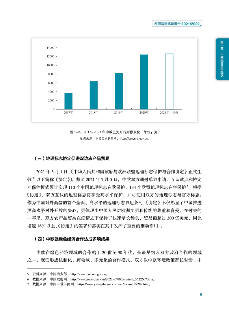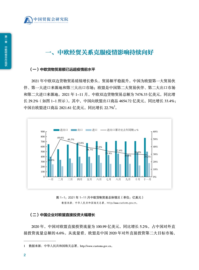 《報(bào)告》顯示,新冠肺炎疫情反復(fù)延宕,世界經(jīng)濟(jì)復(fù)蘇緩慢,但是中歐雙邊貿(mào)易投資規(guī)模逆勢(shì)上揚(yáng)、增長(zhǎng)迅速。截至2021年11月,中歐雙邊貨物貿(mào)易總額為7476.33億美元,同比增長(zhǎng)29.2%。中國(guó)是歐盟第一大貿(mào)易伙伴,歐盟為中國(guó)第二大貿(mào)易伙伴。2021年1-9月,中國(guó)對(duì)歐盟直接投資49.9億美元,增長(zhǎng)54%。