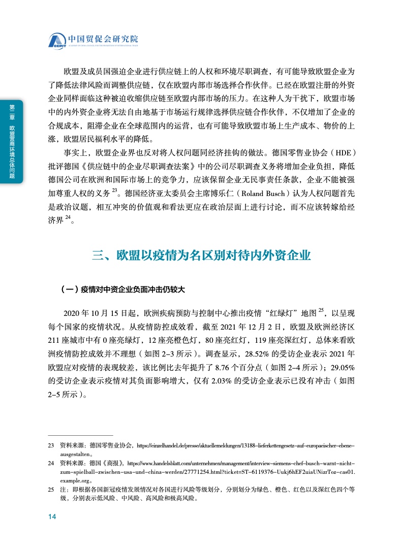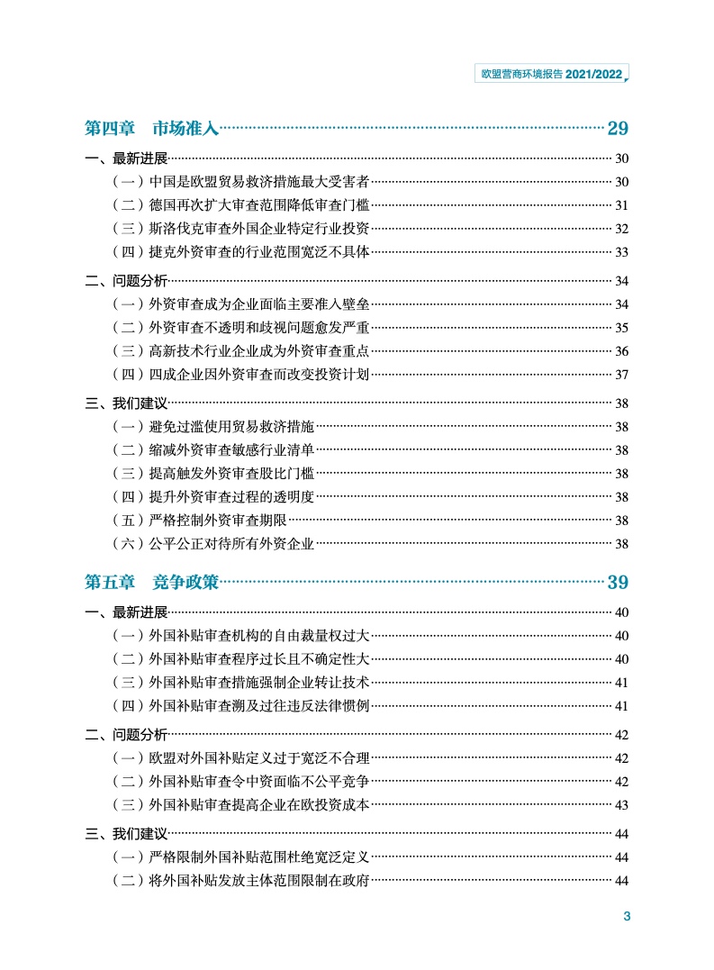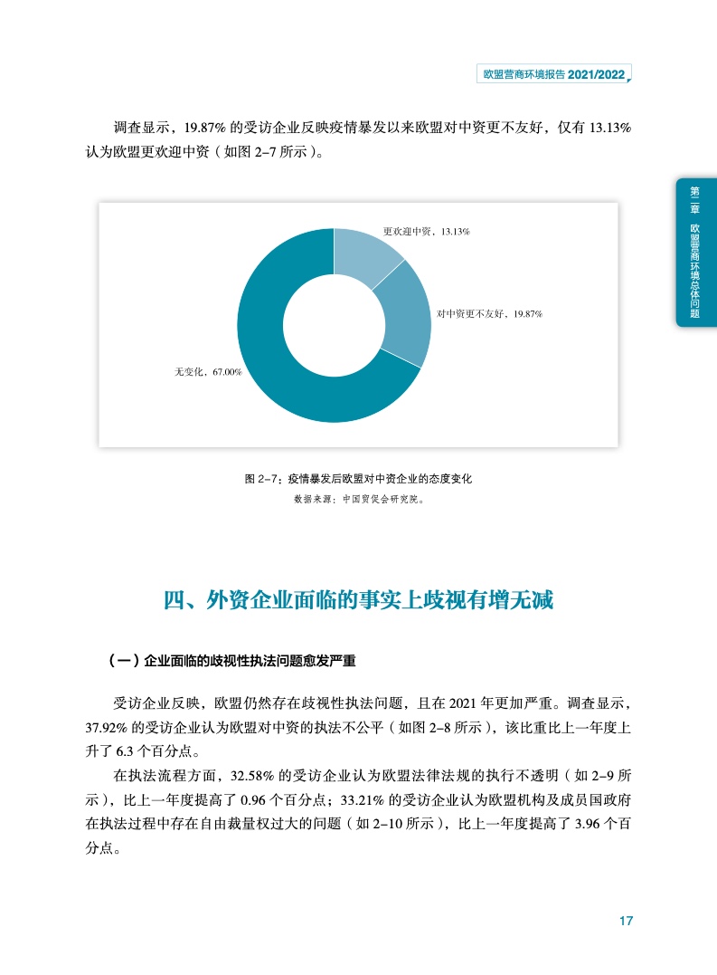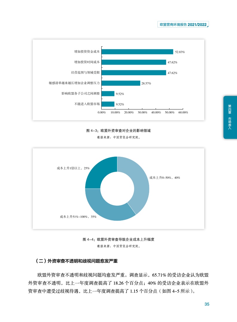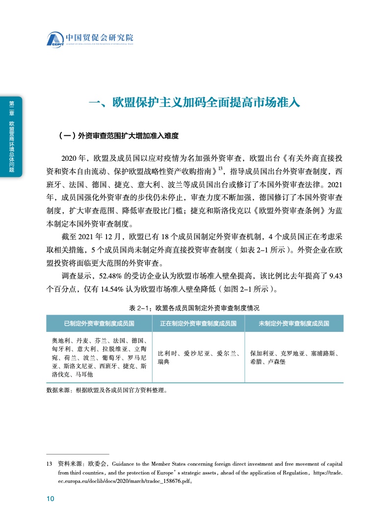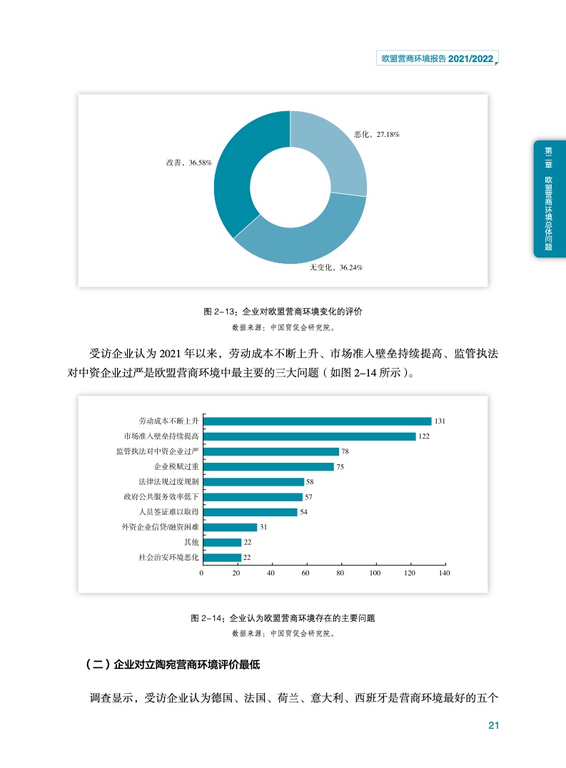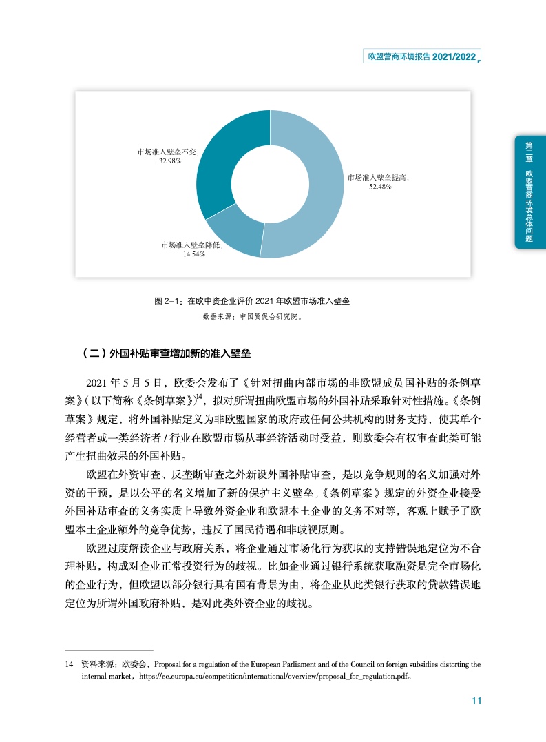 《報(bào)告》認(rèn)為,歐盟的營(yíng)商環(huán)境仍有待改善,例如在外資審查、外國(guó)補(bǔ)貼審查、公共采購(gòu)審查等方面市場(chǎng)準(zhǔn)入壁壘較高,給與歐盟開(kāi)展貿(mào)易投資合作的中國(guó)企業(yè)造成不利影響。