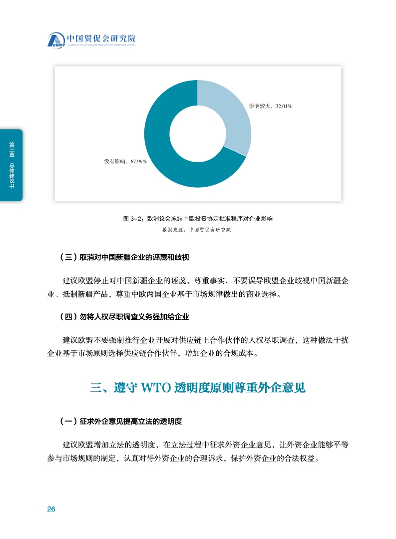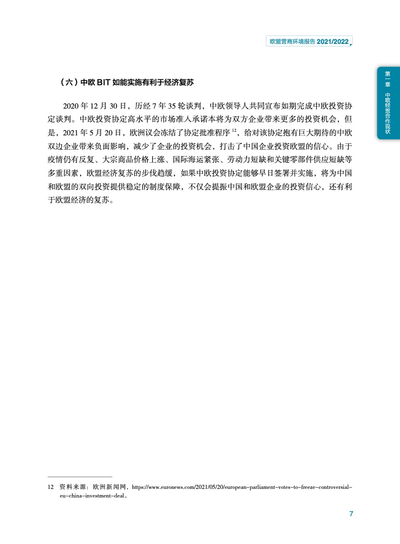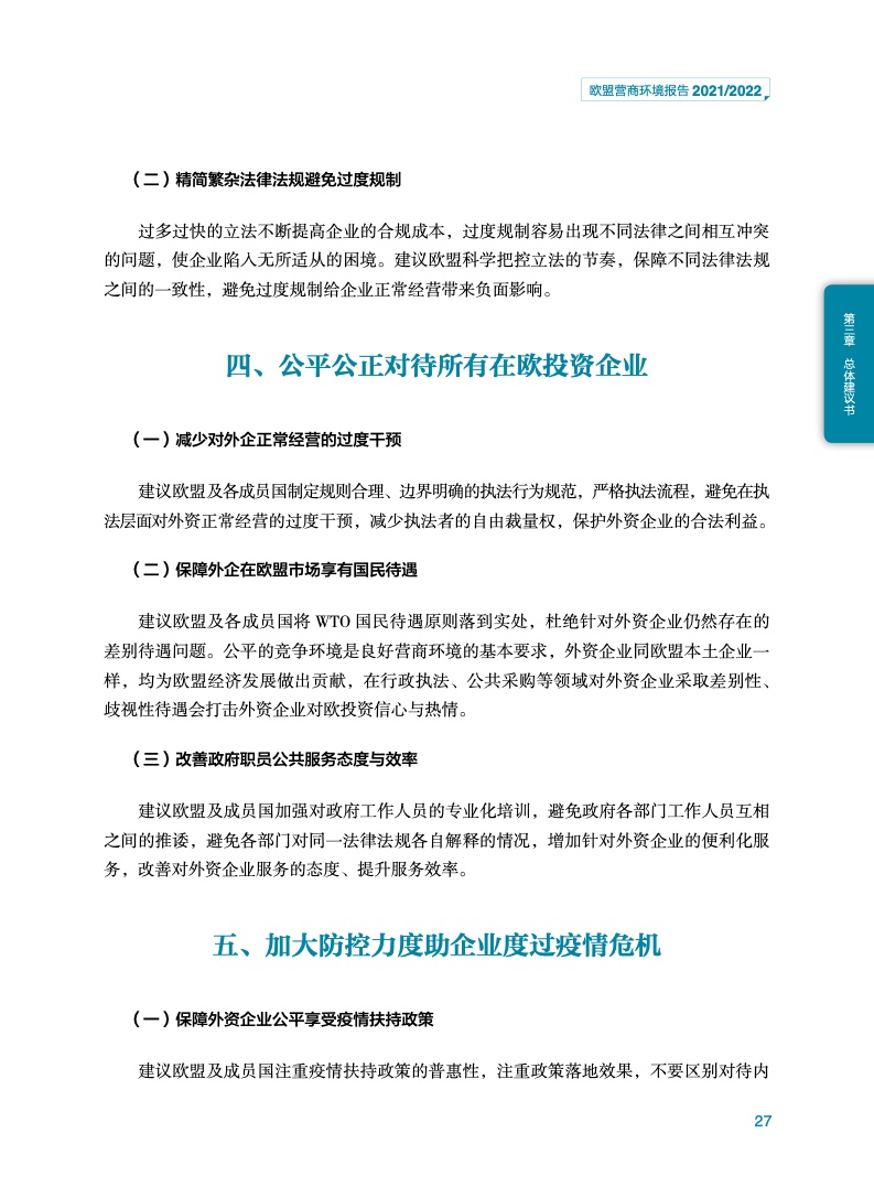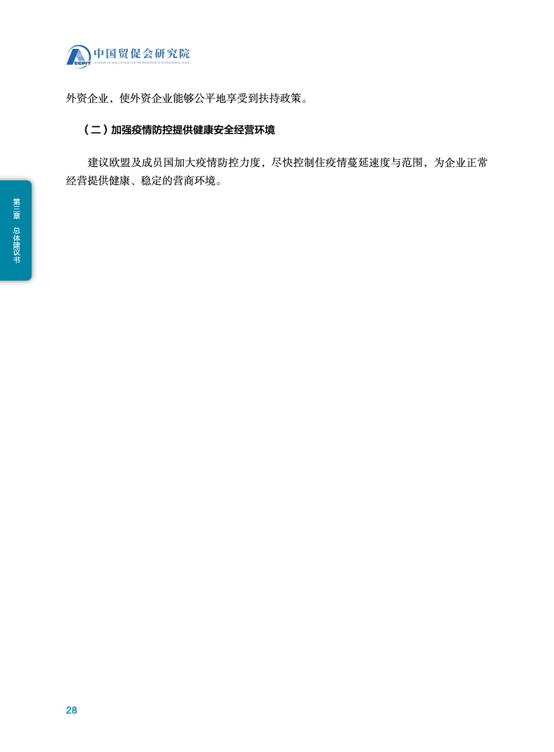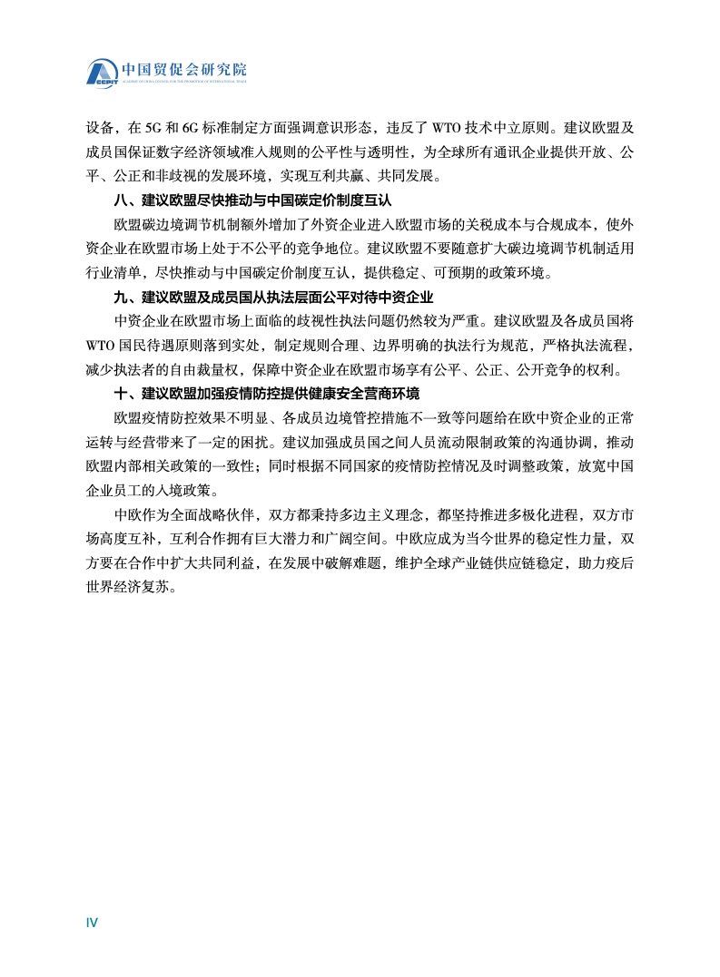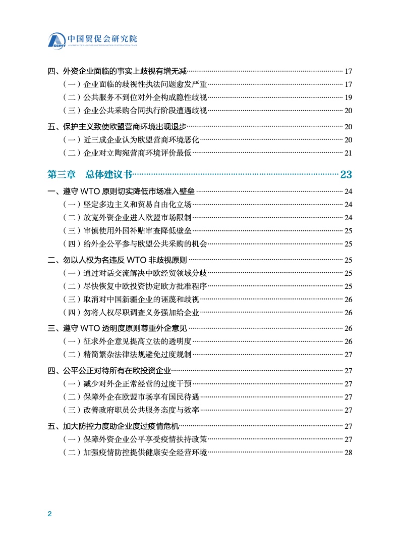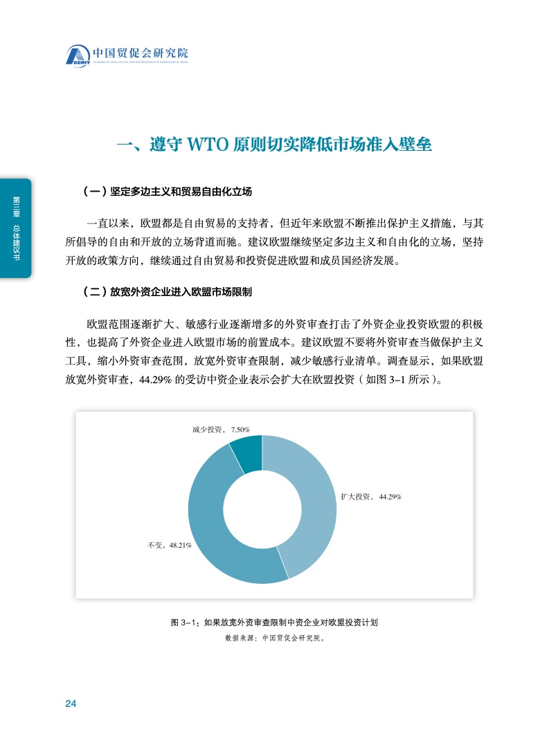 《報(bào)告》建議,繼續(xù)堅(jiān)定貿(mào)易自由化和多邊主義的立場(chǎng),重啟中歐投資協(xié)定批準(zhǔn)程序,放寬外資進(jìn)入歐盟市場(chǎng)的限制,謹(jǐn)慎使用外國(guó)補(bǔ)貼審查工具,保障中資企業(yè)公平參與公共采購(gòu),推動(dòng)與中國(guó)碳定價(jià)制度互認(rèn),從執(zhí)法層面公平對(duì)待中資企業(yè),加強(qiáng)疫情防控等措施,可幫助歐盟重塑良好的營(yíng)商環(huán)境,提升中資企業(yè)對(duì)歐盟投資的信心。