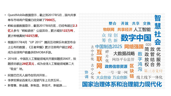 通過(guò)這樣一組數(shù)據(jù),我們也可以看到近幾年在人工智能、共享經(jīng)濟(jì)、公益方面出現(xiàn)了很多值得關(guān)注的變化。生產(chǎn)關(guān)系和社會(huì)關(guān)系實(shí)際上也在經(jīng)歷著數(shù)字化洗禮、網(wǎng)絡(luò)化重塑和分權(quán)化再造,這種情況下我們政府治理模式也進(jìn)入了新的歷史階段。