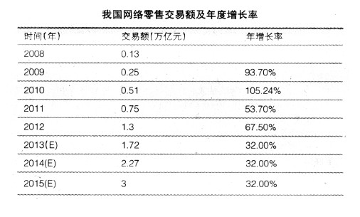 近日,國務(wù)院印發(fā)《關(guān)于促進(jìn)信息消費(fèi)擴(kuò)大內(nèi)需的若干意見》(以下簡稱《意見》),提出到2015年,基于電子商務(wù)、云計算等信息平臺的消費(fèi)快速增長,電子商務(wù)交易額超過18 萬億元,網(wǎng)絡(luò)零售交易額突破3 萬億元,為電子商務(wù)提出了發(fā)展目標(biāo)。