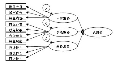 前試的主要目的不在于給出對網(wǎng)站的測評結(jié)論,而是驗證后續(xù)將要使用的評估指標(biāo)體系的維度劃分是否具有結(jié)構(gòu)性依據(jù)。這是進行測評非常有必要。由于上一期我們提到的政府門戶績效架構(gòu)(GPPA)是一個完備的績效管理模型,根據(jù)其中從服務(wù)參考模型(SRM)的基本模塊要求,我們篩選了最為關(guān)鍵的10個方面作為擬篩選的指標(biāo)。調(diào)查對象為曾使用過當(dāng)?shù)卣T戶網(wǎng)站浙江省普通市民,共發(fā)放問卷500份,回收310份,其中有效問卷263份。探索性因子分析經(jīng)過最大方差旋轉(zhuǎn)后,提取 3個主因子,共解釋總方差的67。296%; AMOS5。0軟件進一步通過驗證性因素分析確定模型對實際數(shù)據(jù)的擬合程度,χ2/df的值均小于5,擬合良好性指標(biāo)、調(diào)整擬合良好性指標(biāo)、常規(guī)擬合指標(biāo)、比較擬合指標(biāo)值均在0。85 %以上,RMSEA的置信區(qū)間上限在0。08以下,模型的擬合效果比較好。其結(jié)構(gòu)關(guān)系如下圖所示: