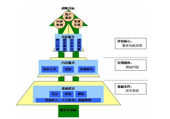 針對政府門戶績效架構(gòu)(GPPA)中的服務(wù)參考模型(SRM)和績效參考模型(PRM),浙江省城市門戶網(wǎng)站評估的可以根據(jù)參考模型中的輸入、輸出、結(jié)果之間的因果關(guān)系來設(shè)計,以服務(wù)產(chǎn)生的價值鏈為主線,來理解服務(wù)價值增值關(guān)鍵條件、實現(xiàn)過程,并從使用者滿意度的角度來評估最后的產(chǎn)出,最終實現(xiàn)“提高政府公共服務(wù)水平,構(gòu)建服務(wù)型政府” 的戰(zhàn)略目標(biāo)。