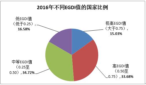 整體調(diào)查結(jié)果來看,各國電子政務(wù)水平增長快速。EGDI值劃分為極高、高、中等和低共4個類別,具有"高EGDI值"和"極高EGDI值"的國家數(shù)量在 2016年有所增加。具有極高EGDI值的國家有29個,大多數(shù)為歐洲國家(占比66%);具有高EGDI值的國家為65個,這個數(shù)據(jù)相較于2014年的調(diào)查有3個國家的增加;具有中等EGDI值的國家數(shù)量為67個;具有低EGDI值的國家數(shù)量為32個。