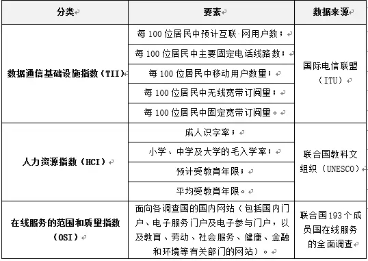 EGDI是電子政務(wù)三個重要維度上三項標準指數(shù)的加權(quán)平均數(shù),包括數(shù)據(jù)通信基礎(chǔ)設(shè)施指數(shù)(TII)、人力資源指數(shù)(HCI)和在線服務(wù)的范圍和質(zhì)量指數(shù)(OSI),各維度的具體評價要素如表1所示。