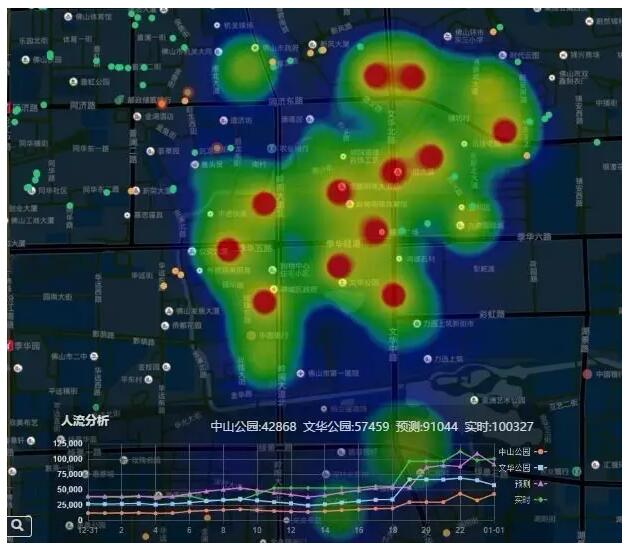 第三是預判用數(shù)據(jù)說話,依托大數(shù)據(jù)分析能力增強工作的針對性和精確性。佛山有一個新年倒計時活動,我們跟三大運營商的手機實時信息對接,監(jiān)控人流密度,當超過某一個值的,發(fā)現(xiàn)預警對人流進行實時疏散。下圖是演示疏散情況,紅色的點是新年倒計時活動人流量最多的區(qū)域,我們在人流量最多的地方做了一個疏散的區(qū)域,及時進行疏散。
