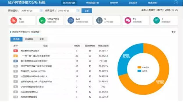 接下來給大家介紹一些我們在媒體上做的一些例子,我們對一個事件、或者專題進(jìn)行傳播分析的時候,會形成整個事件的傳播力指數(shù)(見下圖),其中就是所說的網(wǎng)站、APP、微博、微信等的轉(zhuǎn)載、互動等情況進(jìn)行評判的,以可視化的形式進(jìn)行展現(xiàn),還可以抽取出所發(fā)布信息中的一些熱詞,以熱點詞云的形式進(jìn)行展現(xiàn)。