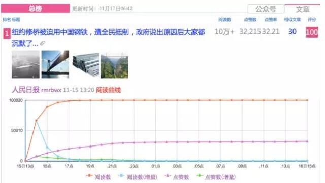 對微信公眾號影響力的排行,可以從公眾號的閱讀數(shù)、點贊數(shù)、文章數(shù)等多項指標(biāo)進(jìn)行打分,評比出微信公眾號的影響力指數(shù)。還可以對一篇文章進(jìn)行分析,看到這一篇文章的閱讀數(shù)、點贊數(shù)、相似文章以及整個閱讀曲線(見下圖),從閱讀曲線上我們就可以看到,這篇稿件下午1點到3點閱讀數(shù)量增長的非常快,我們可以推斷,可能是在午休的時候大家看到了這篇文章,并且快速的傳播,我們也可以根據(jù)用戶的閱讀曲線去調(diào)整微信文章的發(fā)布時間,在用戶閱讀量比較高的時間去發(fā)布新的文章,可能也會帶來不錯的效果。