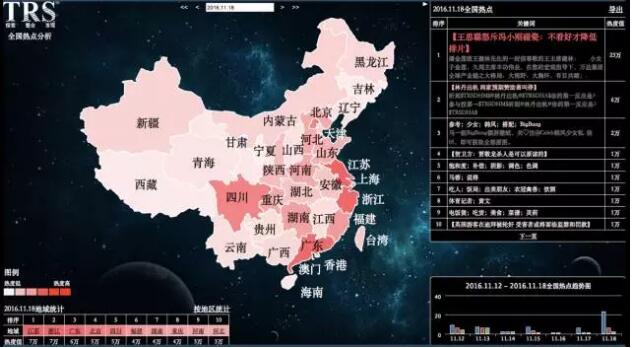 下圖是微博上的熱點事件,也是通過我們的大數(shù)據(jù)中心采集大量的微博數(shù)據(jù),完全自動形成的這樣的微博熱點分析,可以看到按地域的微博熱度,以及全國的微博熱點事件。