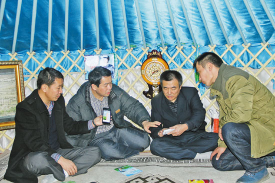 信息服務(wù)部門人員現(xiàn)場為農(nóng)牧民演示如何使用蒙古文手機(jī)