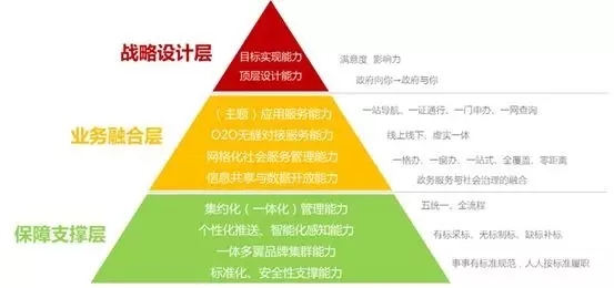 “三用三無”云政府的構建包括三個層面:戰(zhàn)略設計層、業(yè)務融合層、保障支撐層,各個層面所對應的能力如下圖所示: