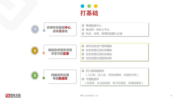 在打基礎(chǔ)上,各級(jí)政府部門需要統(tǒng)籌布局?jǐn)?shù)據(jù)中心、政務(wù)云建設(shè),在政務(wù)云建設(shè)之后要重點(diǎn)考慮籌建數(shù)據(jù)中心,建設(shè)統(tǒng)一政務(wù)云平臺(tái)還有機(jī)房、系統(tǒng)、網(wǎng)絡(luò)的部署與遷移;在編制政府信息資源、共享開放目錄方面,從政務(wù)信息資產(chǎn)清單編制到信息資源目錄標(biāo)準(zhǔn)編制再到信息資源目錄體系建設(shè)以及信息資源目錄管理系統(tǒng)的建設(shè)都非常重要。信息資源共享開放目錄是基礎(chǔ)工程也是非常重要的工程。構(gòu)建政府應(yīng)用專題數(shù)據(jù)庫(kù)方面,除了構(gòu)建四大基礎(chǔ)數(shù)據(jù)庫(kù)(人口庫(kù)、法人庫(kù)、空間地理庫(kù)、宏觀經(jīng)濟(jì)庫(kù)),還要構(gòu)建專題數(shù)據(jù)庫(kù)(共享庫(kù)、社會(huì)信用庫(kù)、電子證照庫(kù)、環(huán)境資源庫(kù))。