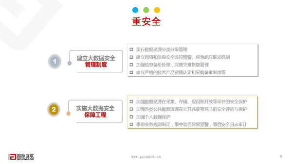 最后是政務(wù)數(shù)據(jù)的開發(fā)應(yīng)用,主要是通過三個(gè)方面來體現(xiàn)政務(wù)數(shù)據(jù)的應(yīng)用程度。首先是優(yōu)政,提高政府治理能力。體現(xiàn)在提高政府決策能力(用數(shù)據(jù)說話、領(lǐng)導(dǎo)決策桌面、可視化平),提高政府管理水平(社區(qū)網(wǎng)格化綜合治理、智慧城市),提高公共服務(wù)能力(互聯(lián)網(wǎng)+政務(wù)服務(wù)、一站式服務(wù))。然后是惠民,服務(wù)改善社會(huì)民生。主要體現(xiàn)在智慧化服務(wù)(智慧旅游、智慧民生、智慧醫(yī)療、智慧交通),移動(dòng)化服務(wù)(微信、支付寶等城市服務(wù)功能、三微一端服務(wù)),平臺(tái)化服務(wù)(網(wǎng)上辦事大廳、市民專屬網(wǎng)頁(yè)、企業(yè)專屬網(wǎng)頁(yè))。最后就是興業(yè),推動(dòng)產(chǎn)業(yè)轉(zhuǎn)型升級(jí)。主要體現(xiàn)在加快產(chǎn)業(yè)產(chǎn)品研發(fā)(產(chǎn)業(yè)轉(zhuǎn)型、智能改造、互聯(lián)網(wǎng)+產(chǎn)業(yè)),提高產(chǎn)業(yè)管理水平(人員、財(cái)務(wù)、庫(kù)存、銷售等管理系統(tǒng)),提高產(chǎn)業(yè)服務(wù)能力(電子商務(wù)、網(wǎng)上客服)。